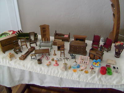 ANTIQUE WOODEN DOLLHOUSE FURNITURE & MISC. ITEMS