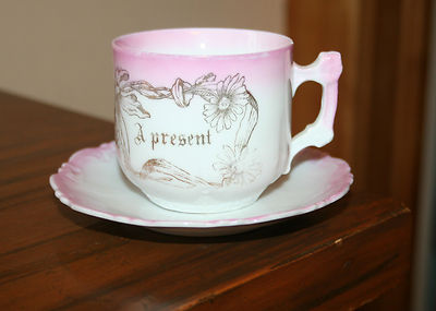Title (ebay affiliate link): Early 1900s "A PRESENT" Christmas China Child's Cup & Saucer. Pink & Gold.