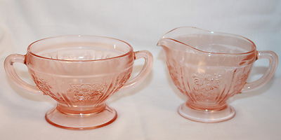 Title (ebay affiliate link): Vintage Jeannette Pink Carnival Glass Rose Pattern Open Sugar Bowl & Creamer