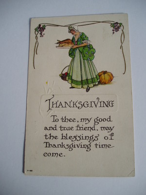 Title (ebay affiliate link): Thanksgiving~1922~art deco~pilgrim lady carries turkey on platter~embossed~T-68