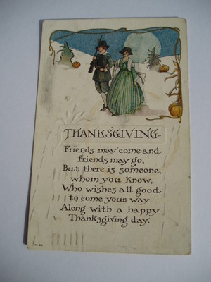 Thanksgiving~1920~art deco~pilgrim couple~musket~haystacks~pumpkin~embossed~T-68