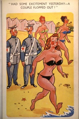 Title (ebay affiliate link): 1950's British Unused risque BREASTS POPPING OUT OF TINY BIKINI TOPS card y5165
