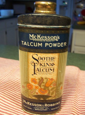 Title (ebay affiliate link): Talcum Powder Tin-McKesson's-Robbins- Inc-New York-Bridgeport-Montreal-1930's-NR