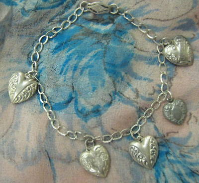 Title (ebay affiliate link): Antique Victorian Puffy Heart Charm Bracelet Sterling
