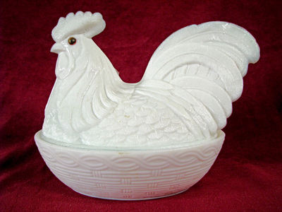 Challinor Taylor Milk Glass Rooster Covered Dish