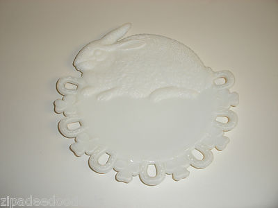 Title (ebay affiliate link): Vintage White Milk Glass Bunny Rabbit Plate w/ Clovers Shamrocks & Horse Shoes