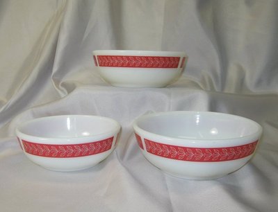 Title (ebay affiliate link): 3 VINTAGE PYREX BOWLS BY CORNING WHITE MILK GLASS WITH RED LEAF TRIM