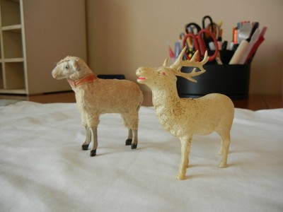 Antique primitive putz wooly sheep or lamb Germany and plastic japan reindeer
