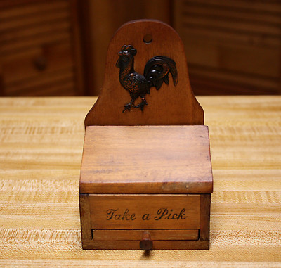 Title (ebay affiliate link): Vintage Wood Toothpick Holder Server Brass Tin Rooster Decorated