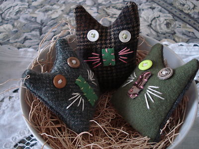 Title (ebay affiliate link): 3 Primitive Cat Bowl Drawer Fillers Shelf Sitters Folk Art Old Wool Kitty Ornies