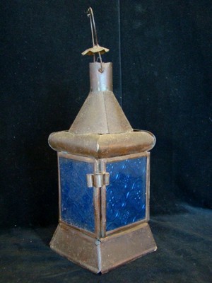 Wonderful Antique Small Primitive Metal Candle Lantern BLUE STAMPED GLASS PANELS