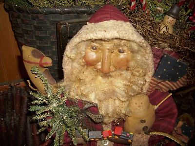 Primitive handmade folk art santa claus doll , basket, antique fabric, snowman,