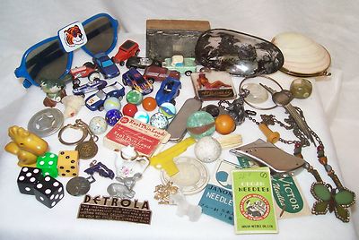 Title (ebay affiliate link): Vintage Junk Drawer Lot-Marbles-Tokens-Key Chains-Fobs?-Advertising-Woodstock-NR