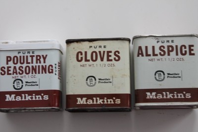 Title (ebay affiliate link): Vintage Farmhouse Brown Malkins Cloves Allspice Poultry Seasoning Spice Tins