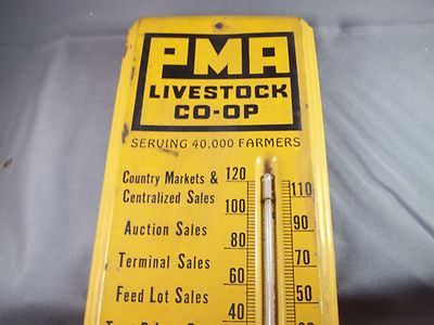 OLD VINTAGE INDIANA METAL PMA LIVESTOCK CO-OP FARMERS FARM THERMOMETER RUSTIC