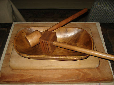 Title (ebay affiliate link): Primitive Old Vintage Antique Dough Bowl and Wood Mashers