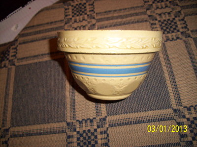 Title (ebay affiliate link): Yelloware Bowl TINY Primitive Rare Unique Berry Edge 3 blue stripes Yellow Ware