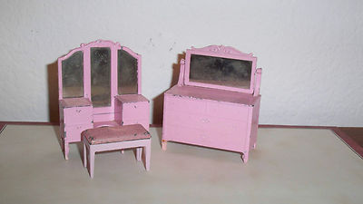 TOOTSIE TOY ANTIQUE DOLL HOUSE FURNITURE PINK DRESSER & DRESSING TABLE W/ BENCH