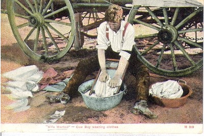 COWBOY WASHING CLOTHES, WIFE WANTED, CHAS. E. MORRIS, CHINOOK, MT, 1909