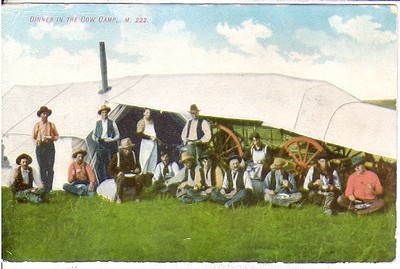 Title (ebay affiliate link): DINNER IN THE COW CAMP, ca 1910, copr. by CHAS. E. MORRIS, CHINOOK, MT