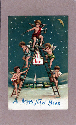 Title (ebay affiliate link): New Year, 5 Cherubs (Angels) Climbing Ladder, Money Bags, 1908 Germany Postcard