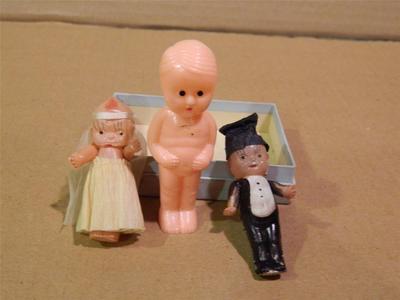 3 Celluloid Dolls Bride & Groom & Frozen Charlotte Style Antique