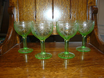 Title (ebay affiliate link): Cameo or Ballerina Green Depression Glass, 4" Wine Goblets, Set of Four, Mint!