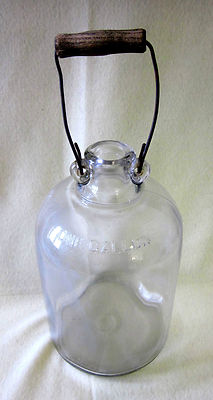 Title (ebay affiliate link): Vintage Glass Gallon Milk Jug Bottle Wire & Wooden Bail Handle