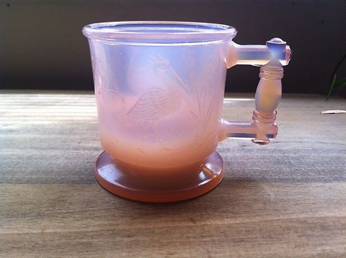 Title (ebay affiliate link): Antique Childs Mug-Pink Translucent Milk Glass-Egret & Flamingo Pattern