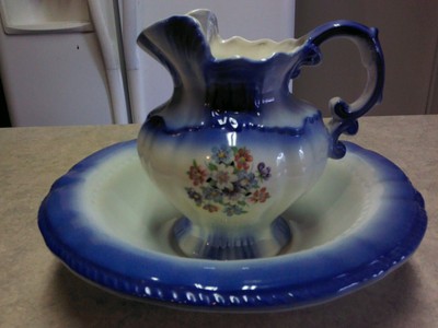 Title (ebay affiliate link): Beautiful Vintage Pitcher and Bowl Blue and White with Flowers