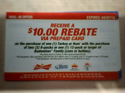 Title (ebay affiliate link): Budweiser Family Beer & Turkey or Ham Rebate Offer