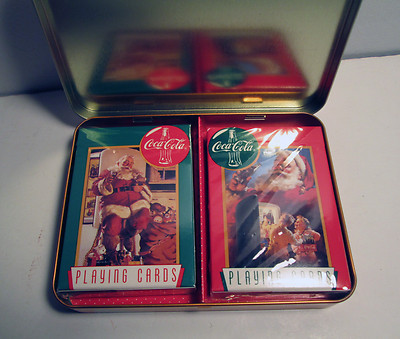 Title (ebay affiliate link): Coca Cola Playing poker Cards Collectible Tin Set 2 Decks Santa Christmas 1995