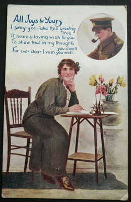Title (ebay affiliate link): POSTCARD WW1 MILITARY SOLDIER SMOKING PIPE & WIFE SWEETHEART WRITING LETTERS