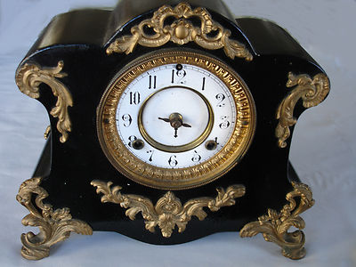 Title (ebay affiliate link): ANTIQUE WATERBURY MANTLE CLOCK CAST IRON -W/ PORCLAIN DIAL FACE -NO RES.