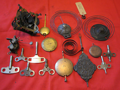 Pile of Antique Clock Works Pendulums Keys & More