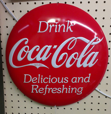 Title (ebay affiliate link): Embossed 14" Tin Coca-Cola Button Sign -NEW - NO RESERVE