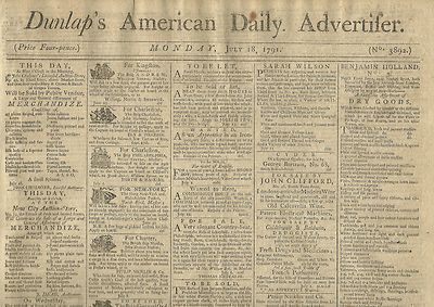 Title (ebay affiliate link): Early American paper 1791 "DUNLAP'S AMERICAN DAILY ADVERTISER" July 18, 1791