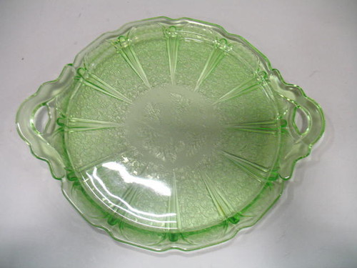 Title (ebay affiliate link): Jeannette Cherry Blossom Depression Green Serving Cake Plate Handle Serving Tray