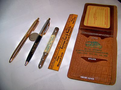 Title (ebay affiliate link): Vintage 1930s Coal Company leather wallet+wood 6'' ruler+bullet pencil+2 pens