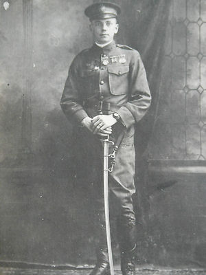 WWI Soldier in Uniform w/ Sword in front of Leaded Glass Window (James T. Leach)