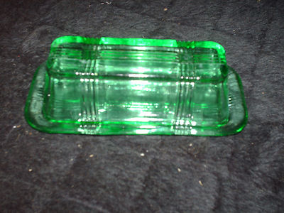 GREEN GLASS COVERED BUTTER DISH CRISS CROSS PATTERN 1/4 LB. SIZE