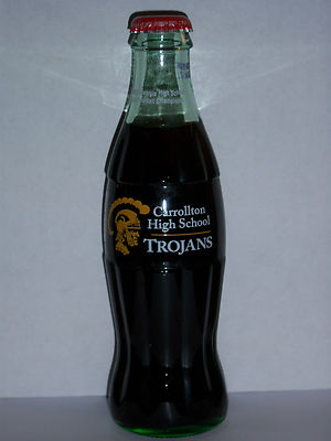 Title (ebay affiliate link): 8 OZ COCA COLA COMMEMORATIVE BOTTLE - CARROLLTON HIGH SCHOOL TROJANS 1998
