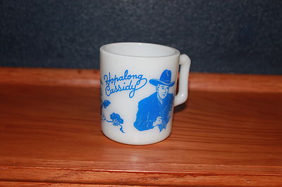 Title (ebay affiliate link): HOPALONG CASSIDY BLUE & MILK GLASS DRINKING MUG CHILDS CUP 1950's TV COWBOY HERO