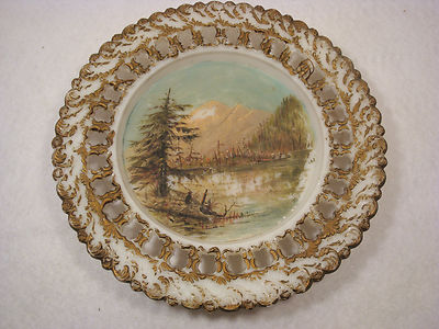 VINTAGE HAND PAINTED MILK GLASS RETICULATED PLATE MOUNTAIN LAKE SCENE GOLD GILT