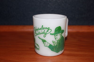 Title (ebay affiliate link): HOPALONG CASSIDY GREEN & MILK GLASS DRINKING MUG CHILDS CUP 1950s TV COWBOY HERO