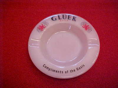 GLUEK BEER COMPLIMENTS OF THE OASIS MILK GLASS ADVERTISING ASHTRAY