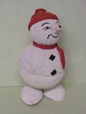 Title (ebay affiliate link): Vintage Paper Mache Snowman Nodder Candy Container, Red Hat, Putz Nose European?