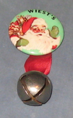 VINTAGE YORK PA SANTA CLAUS PINBACK BTTON W/ BELL CHRISTMAS WIEST'S STORE