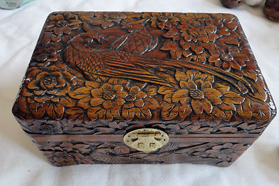 Title (ebay affiliate link): ANTIQUE ASIAN WOOD HAND CARVED BOX WITH PEACOCKS, FLOWERS AND BIRDS HINGED
