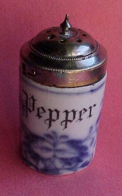 Antique Flow Blue Cobalt On White Silver On Brass Metal Top Pepper Shaker